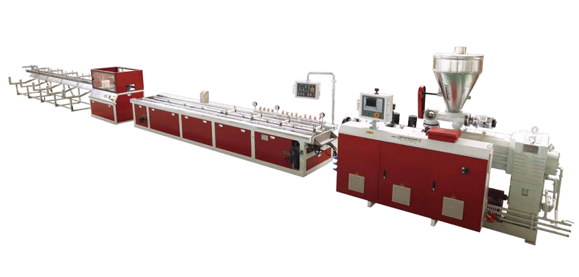 目前兩步法應(yīng)用較為廣泛,一般是用錐雙擠出機(jī)或平雙擠出機(jī)造粒,再用錐雙或單螺桿擠出機(jī)擠出成型制品,主要使用在室內(nèi)外地板、護(hù)欄、托盤等PE一類木塑產(chǎn)品的擠出成型。主要優(yōu)點(diǎn)是:操作簡單,對生產(chǎn)員工整體技術(shù)水平要求較低,對配套模具和擠出成型設(shè)備要求相對比一步法要低。